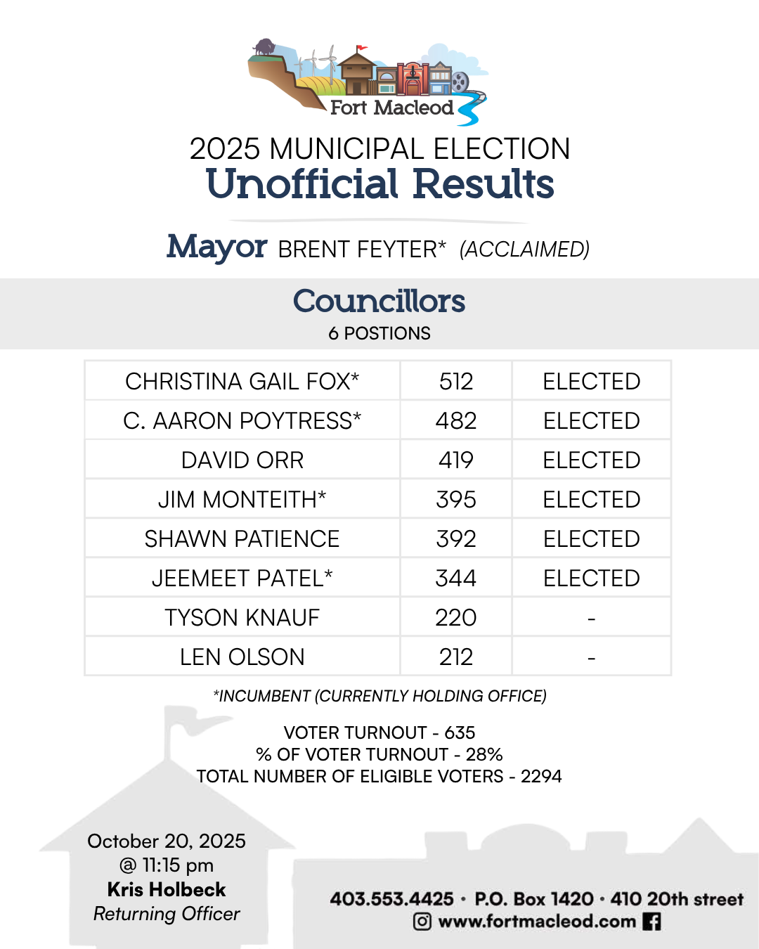 We are pleased to announce the unofficial results for the 2025 Town of Fort Macleod Municipal Election: