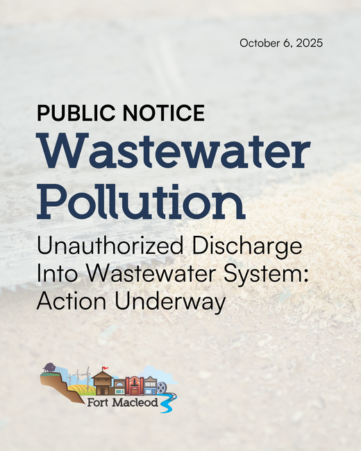 Please be advised that the Town of Fort Macleod has discovered that unauthorized pollutants, specifically large volumes of wood-based products, are being discharged into the municipal wastewater system. This has caused damage to equipment at the wastewater treatment plant and placed significant strain on the system.